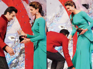 Ranbir Kapoor has taken all by surprise when he bent down to touch Deepika Padukone’s feet at Colors Screen award function. Ranbir touched Subhash Ghai’s feet and seeks his blessings then he went to Deepika, bowed to touch her feet.