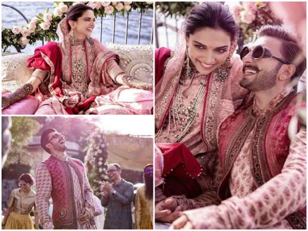ಮೆಹಂದಿ-ಸಂಗೀತ ಸಮಾರಂಭಕ್ಕೆ ವಧು ದೀಪಿಕಾ ಪಡುಕೋಣೆ ಮತ್ತು ವರ ರಣ್ವೀರ್ ಸಿಂಗ್ ಪಿಂಕ್ ಮತ್ತು ಕೆಂಪು ಬಣ್ಣದ ಸಭ್ಯಸಾಚಿ ಉಡುಗೆಗಳನ್ನು ತೊಟ್ಟಿದ್ದರು.
