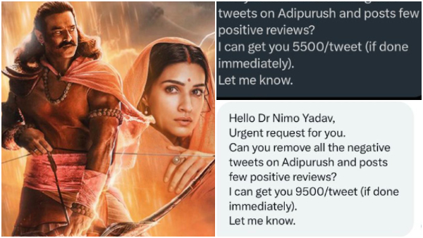ಕೆಲವರು ಸೋಶಿಯಲ್ ಮೀಡಿಯಾದಲ್ಲಿ ಸ್ಕ್ರೀನ್ ಶಾಟ್ಗಳನ್ನು ಶೇರ್ ಮಾಡಿದ್ದಾರೆ. " ನಿಮ್ಮ ಹತ್ತು ತುರ್ತಾಗಿ ಒಂದು ಮನವಿ. ನೀವು ಆದಿಪುರುಷ್ ಬಗೆಗಿನ ನೆಗೆಟಿವ್ ಟ್ವೀಟ್ಗಳನ್ನು ತೆಗೆದು ಹಾಕಬಹುದೇ? ನಾನು ನಿಮಗೆ 9500 ರೂಪಾಯಿಯನ್ನು ಪ್ರತಿ ಟ್ವೀಟ್ಗೆ ನೀಡುತ್ತೇನೆ" ಎಂದು ಒಂದು ಸ್ಕ್ರೀನ್ ಶಾಟ್ನಲ್ಲಿ ಇದೆ.
