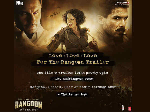 ಅಂದಹಾಗೆ 'ರಂಗೂನ್' ಚಿತ್ರದಲ್ಲಿ ಬಾಲಿವುಡ್ ಚಿತ್ರರಂಗದ ಗಟ್ಟಿಗಿತ್ತಿ ನಟಿ ಕಂಗನಾ ರನೌತ್ ಗೆ ಶಾಹಿದ್ ಕಪೂರ್ ಮತ್ತು ಸೈಫ್ ಅಲಿ ಖಾನ್ ಇಬ್ಬರು ನಟರು.[ಅಸಲಿ ಸತ್ಯ ಹೊರಬೀಳಲಿದೆ': ಕಂಗನಾಗೆ ಟಾಂಗ್ ಕೊಟ್ಟ ಹೃತಿಕ್]