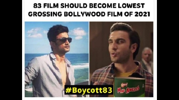 ಸುಶಾಂತ್ ಅಭಿಮಾನಿಗಳು '83' ಸಿನಿಮಾ ಬಾಯ್ಕಾಟ್ ಮಾಡುವಂತೆ ಅಭಿಯಾನ ಆರಂಭಿಸಿದ್ದಕ್ಕೆ ಜಾಹೀರಾತು ಒಂದೇ ಕಾರಣವಲ್ಲ. ಸುಶಾಂತ್ ಸಿಂಗ್ ರಜಪೂತ್ ನಟಿಸಿದ ಎಂ ಎಸ್ ಧೋನಿ: ಅನ್ಟೋಲ್ಡ್ ಸ್ಟೋರಿ ಸಿನಿಮಾದೊಂದಿಗೆ ಹೋಲಿಕೆ ಮಾಡಲಾಗುತ್ತಿದೆ. ಇದಕ್ಕೂ ಸುಶಾಂತ್ ಸಿಂಗ್ ರಜಪೂತ್ ಅಭಿಮಾನಿಗಳು ಸಿಟ್ಟಿಗೆದ್ದಿದ್ದಾರೆ. 'ಬಾಯ್ಕಾಟ್ 83' ಬ್ಯಾನ್ ಮಾಡುವಂತೆ ಅಭಿಯಾನ ಅರಂಭಿಸಿದ್ದಕ್ಕೆ ಇದೂ ಒಂದು ಕಾರಣ.