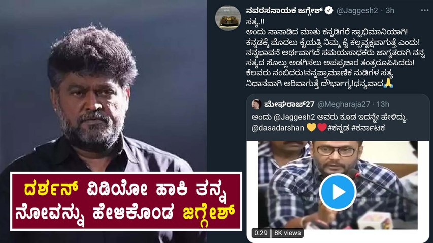 ದರ್ಶನ್ ಮಾತನಾಡುತ್ತಿರುವ ವಿಡಿಯೋ ಶೇರ್ ಮಾಡಿ ಜಗ್ಗೇಶ್, 'ಅಂದು ನಾನಾಡಿದ ಮಾತು ಕನ್ನಡಿಗರೆ ಸ್ವಾಭಿಮಾನಿಯಾಗಿ. ಕನ್ನಡಕ್ಕೆ ಮೊದಲು ಕೈಯತ್ತಿ ನಿಮ್ಮ ಕೈ ಕಲ್ಪವೃಕ್ಷವಾಗುತ್ತೆ ಎಂದು. ನನ್ನ ಭಾವನೆ ಅರ್ಥವಾಗದೆ ಸಮಯ ಸಾಧಕರು ಜಾಗೃತರಾಗಿ ನನ್ನ ಸತ್ಯದ ಸೊಲ್ಲು ಅಡಗಿಸಲು ಅಪಪ್ರಚಾರ ತಂತ್ರರೂಪಿಸಿದರು. ಕೆಲವರು ನಂಬಿದರು. ನನ್ನಪ್ರಾಮಾಣಿಕ ನುಡಿಗಳ ಸತ್ಯ ನಿಧಾನವಾಗಿ ಅರಿವಾಗುತ್ತೆ ದೌರ್ಭಾಗ್ಯ' ಎಂದು ಹೇಳಿದ್ದಾರೆ.