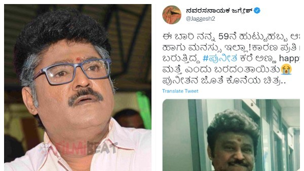 ಜಗ್ಗೇಶ್ ಅವರು ಹುಟ್ಟುಹಬ್ಬವನ್ನು ಆಚರಣೆ ಮಾಡಿಕೊಳ್ಳುತ್ತಿಲ್ಲ. ಈ ವಿಚಾರವನ್ನು ಟ್ವೀಟ್ ಮಾಡಿರುವ ಅವರು "ಈ ಬಾರಿ ನನ್ನ 59ನೇ ಹುಟ್ಟುಹಬ್ಬ ಆಚರಿಸುವುದಿಲ್ಲಾ. ಮನಸ್ಸು ಇಲ್ಲಾ. ಕಾರಣ ಪ್ರತಿ ಮಾರ್ಚ್ 17 ಕ್ಕೆ ತಪ್ಪದೆ ಬರುತ್ತಿದ್ದ, ಪುನೀತ ಕರೆ ಅಣ್ಣ happy birthday ಎಂದು, ಮತ್ತೆ ಎಂದು ಬರದಂತಾಯಿತು. ಎಂದು ಬರೆದುಕೊಂಡು ಪುನೀತ್ ರಾಜ್ಕುಮಾರ್ ಜೊತೆಗೆ ಇರುವ ಫೋಟೊವನ್ನು ಹಂಚಿಕೊಂಡಿದ್ದಾರೆ.