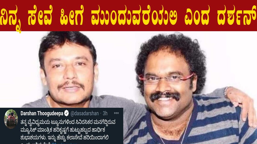 'ತನ್ನ ವೈವಿಧ್ಯಮಯ ಟ್ಯೂನುಗಳಿಂದ ಸಿನಿರಸಿಕರ ಮನಗೆದ್ದಿರುವ ಮ್ಯೂಸಿಕ್ ಮಾಂತ್ರಿಕ ಹರಿಕೃಷ್ಣಗೆ ಹುಟ್ಟುಹಬ್ಬದ ಹಾರ್ಧಿಕ ಶುಭಾಶಯಗಳು. ಇನ್ನು ಹೆಚ್ಚು ಕಲಾಸೇವೆ ಹರಿ ಇಂದ ಆಗಲಿ ಎಂದು ಆಶಿಸುತ್ತೇನೆ' ಎಂದಿದ್ದಾರೆ ನಟ ದರ್ಶನ್.
