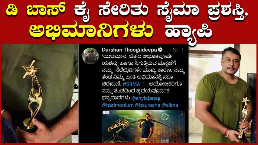 ಇನ್ನು 2019ನೇ ಸಾಲಿನ ಸೈಮಾದಲ್ಲಿ ಯಜಮಾನ ಚಿತ್ರಕ್ಕೆ ಹೆಚ್ಚು ಪ್ರಶಸ್ತಿ ಸಿಕ್ಕ ಹಿನ್ನೆಲೆ ಟ್ವಿಟ್ಟರ್ ಮೂಲಕ ದರ್ಶನ್ ಶುಭಕೋರಿದ್ದರು. ಜೊತೆಗೆ ಅಭಿಮಾನಿಗಳಿಗೆ ಧನ್ಯವಾದ ತಿಳಿಸಿದ್ದರು. 'ಯಜಮಾನ' ಚಿತ್ರದ ಅಭೂತಪೂರ್ವ ಯಶಸ್ಸು ಹಾಗೂ ಸಿಗುತ್ತಿರುವ ಮನ್ನಣೆಗೆ ನಮ್ಮ ಸೆಲೆಬ್ರಿಟಿಗಳೇ ಮುಖ್ಯ ಕಾರಣ. ನಮ್ಮ ತಂಡ ನಿಮ್ಮ ಪ್ರೀತಿ ಅಭಿಮಾನಕ್ಕೆ ಸದಾ ಚಿರಋಣಿ. #SIIMA ಆಯೋಜಕರಿಗೂ ನಮ್ಮ ತಂಡದಿಂದ ಹೃದಯಪೂರ್ವಕ ಧನ್ಯವಾದಗಳು'' ಎಂದಿದ್ದರು. ಮುಂದೆ ಓದಿ....