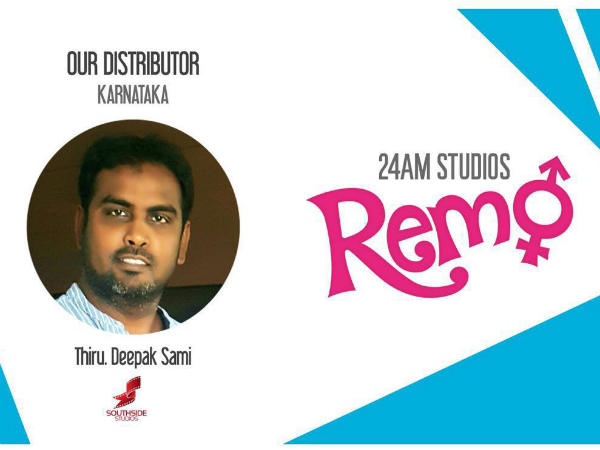 ಇದೀಗ 'ರೆಮೋ' ಚಿತ್ರವನ್ನು ನೋಡಲೆಂದು ಕಾಯುತ್ತಿರುವ ಕರ್ನಾಟಕದ ಅಭಿಮಾನಿಗಳಿಗೆ ಸಿಹಿ ಸುದ್ದಿ ಸಿಕ್ಕಿದೆ. ತಮಿಳು ಸಿನಿಮಾ 'ರೆಮೋ' ಕರ್ನಾಟಕದ ವಿತರಣಾ ಹಕ್ಕನ್ನು ತಿರು ದೀಪಕ್ ಸಾಮಿ ಅವರು ವಹಿಸಿಕೊಂಡಿದ್ದಾರೆ.['ರೆಮೋ' ಆಡಿಯೋ ಲಾಂಚ್ ಗೆ ದಿನಗಣನೆ ಶುರು]