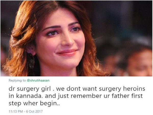 ನಟಿ ಶ್ರುತಿ ಹಾಸನ್ ಮಾಡಿದ ಟ್ವೀಟ್ ನಿಂದ ಬೇಸರಗೊಂಡ ಕನ್ನಡ ಸಿನಿಪ್ರಿಯರೊಬ್ಬರು ''ನಮಗೆ ಪ್ಲಾಸ್ಟಿಕ್ ಸರ್ಜರಿ ಮಾಡಿಸಿಕೊಂಡಿರುವ ಹೀರೋಯಿನ್ ಗಳು ಬೇಡ. ನಿಮ್ಮ ತಂದೆ (ಕಮಲ್ ಹಾಸನ್) ಮೊದಲ ಹೆಜ್ಜೆ ಇಟ್ಟಿದ್ದು ಎಲ್ಲಿ ಎಂಬುದನ್ನ ಮೊದಲ ನೆನಪಿಸಿಕೊಳ್ಳಿ'' ಅಂತ ಟ್ವೀಟ್ ಮಾಡಿದ್ದಾರೆ.
