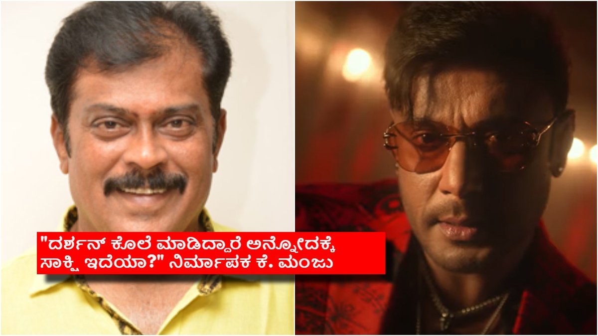 ದರ್ಶನ್ ಕೊಲೆ ಪ್ರಕರಣದಲ್ಲಿ ಭಾಗಿಯಾಗಿದ್ದಾರೆ ಎನ್ನುವುದಕ್ಕೆ ಸಾಕ್ಷಿ ಇದೆಯಾ? ಎಂದು ನಿರ್ಮಾಪಕ ಕೆ. ಮಂಜು ಕೇಳಿದ್ದಾರೆ. "ದರ್ಶನ್ ಹೀಗೆ ಮಾಡಿದ್ದಾರೆ ಅನ್ನೋದಕ್ಕೆ ಸಾಕ್ಷಿ ಇದೆಯಾ? ಅವರು ಹಾಗೆ ಮಾಡಿದ್ದಾರೆ ಅನ್ನೋದಕ್ಕೆ ಸಾಕ್ಷಿ ಇದ್ದರೆ ಒಪ್ಪಿಕೊಳ್ಳೋಣ. ಗ್ರೂಪ್ನಲ್ಲಿ 10 ಜನ ಹೊಡೆದಾಡಿದರೂ ಕರೆದುಕೊಂಡು ಹೋಗುತ್ತಾರೆ. ಬಿ ರಿಪೋರ್ಟ್ ಹಾಕಿದ್ಮೇಲೆ, ನ್ಯಾಯಾಲಯ ತೀರ್ಮಾನ ಮಾಡುತ್ತೆ. ನಾವ್ಯಾರು ತೀರ್ಮಾನ ಮಾಡುವುದಕ್ಕೆ" ಎಂದು ಕೆ. ಮಂಜು ಗುಡುಗಿದ್ದಾರೆ.
