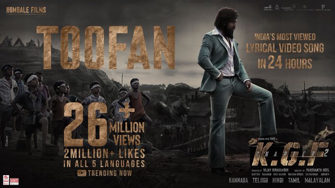 ಈ ಹಾಡಿನ ಮೂಲಕ 'ಕೆಜಿಎಫ್ 2' ಚಿತ್ರದ ದಾಖಲೆ ಲಿಸ್ಟ್ಗೆ ಮತ್ತೊಂದು ದಾಖಲೆ ಸೇರಿಕೊಂಡಿದೆ. ಈಗಾಗಲೇ ಹೆಚ್ಚು ವೀಕ್ಷಣೆ ಪಡೆದು ಟಾಪ್ನಲ್ಲಿ ಇದ್ದ ತಮಿಳಿನ 'ಬೀಸ್ಟ್' ಚಿತ್ರದ ಹಾಡನ್ನು ಕಡಿಮೆ ಸಮಯದಲ್ಲೇ 'ತೂಫಾನ್' ಹಿಂದಿಕ್ಕಿದೆ.