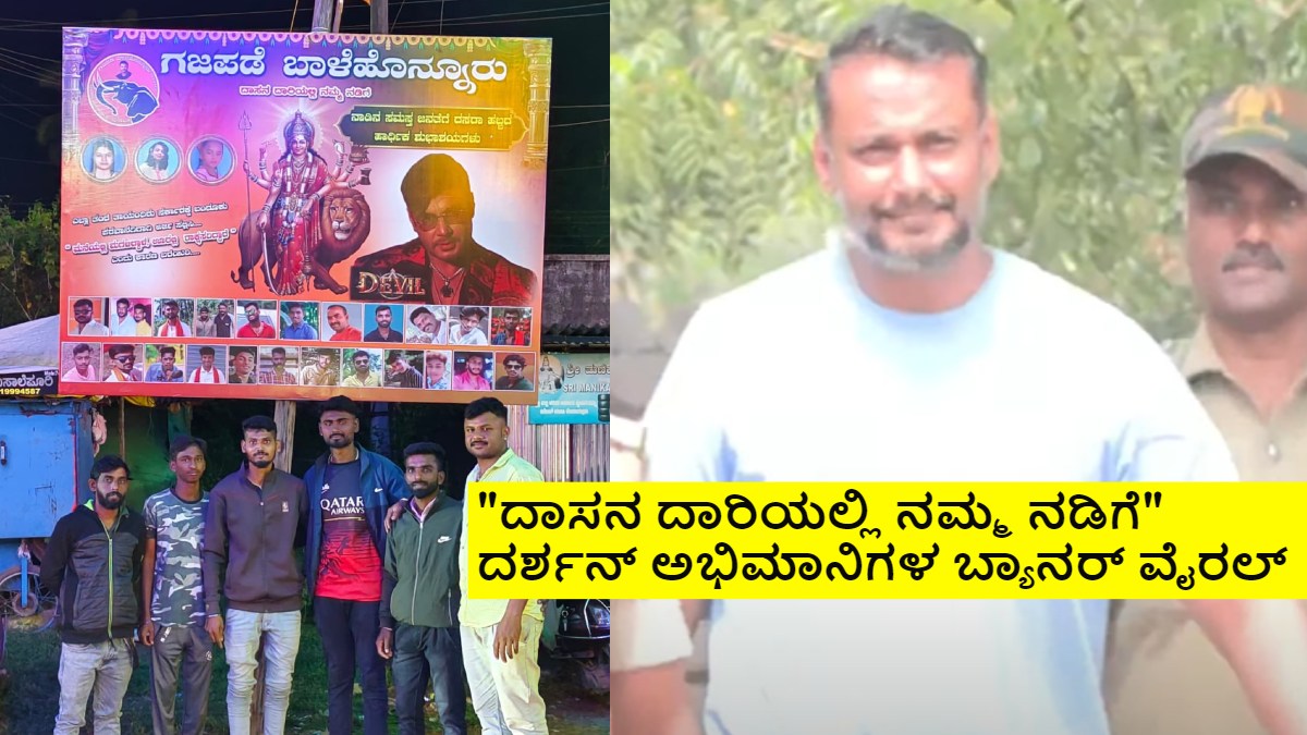 ಇದರ ನಡುವೆಯೇ ಕೆಲ ಅಂಧಾಭಿಮಾನಿಗಳು ವಿಚಿತ್ರ ಪೋಸ್ಟರ್ಗಳನ್ನು ಹಾಕುವ ಮೂಲಕ ಹುಚ್ಚಾಟ ಮೆರೆಯುತ್ತಿದ್ದಾರೆ. ಇದೀಗ ಬಾಳೆಹೊನ್ನೂರಿನಲ್ಲಿ ದರ್ಶನ್ ಅಭಿಮಾನಿಗಳು ಹಾಕಿರುವ ಬ್ಯಾನರ್ ಪೋಸ್ಟರ್ವೊಂದು ಸಾಮಾಜಿಕ ಜಾಲತಾಣದಲ್ಲಿ ಭಾರೀ ವೈರಲ್ ಆಗುತ್ತಿದೆ. ಹಾಗಾದರೆ ಆ ಬ್ಯಾನರ್ನಲ್ಲಿ ಏನು ಬರೆದಿದೆ ಎಂದು ಇಲ್ಲಿ ತಿಳಿಯಿರಿ.