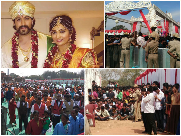ಅಭಿಮಾನಿಗಳಿಗಾಗಿ ದೇಸಿ ಶೈಲಿಯಲ್ಲಿ, ಬಫೆ ಹಾಗೂ ಬಾಲೆ ಎಲೆ ವ್ಯವಸ್ಥೆಯ ಊಟವನ್ನ ಸಿದ್ದ ಮಾಡಲಾಗಿತ್ತು. ಪೂರಿ-ಸಾಗು, ಪಲಾವ್, ಅನ್ನ ಸಾಂಬರ್, ಮುದ್ದೆ, ಪಾಯಸ, ಬೂಂದಿ, ಜಿಲೇಬಿ ಊಟವನ್ನ ಅಭಿಮಾನಿಗಳಿಗಾಗಿ ಮಾಡಿಸಲಾಗಿತ್ತು.['ಯಶೋರಾಧೆ' ಮದುವೆಯ ಭಕ್ಷ್ಯ ಭೋಜನದ ಕಂಪ್ಲೀಟ್ ಮೆನ್ಯೂ]