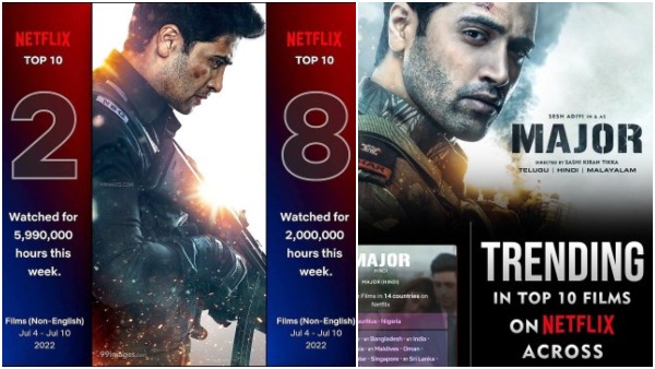 ಶಶಿ ಕಿರಣ್ ಟಿಕ್ಕಾ ನಿರ್ದೇಶಿಸಿರುವ 'ಮೇಜರ್' ಥಿಯೇಟರ್ಗಿಂತ ಒಟಿಟಿ ವೇದಿಕೆಯಲ್ಲಿಯೇ ಹೆಚ್ಚು ಸದ್ದು ಮಾಡುತ್ತಿದೆ. ನೆಟ್ಫ್ಲಿಕ್ಸ್ನಲ್ಲಿ ಅಡಿವಿ ಶೇಷ್ ಸಿನಿಮಾ ಈಗ ಸ್ಟ್ರೀಮಿಂಗ್ ಆಗುತ್ತಿದ್ದು, ದಾಖಲೆಗಳನ್ನು ಬ್ರೇಕ್ ಮಾಡುತ್ತಿದೆ. ಸದ್ಯ ನೆಟ್ಫಿಕ್ಸ್ ನೀಡಿರುವ ಮಾಹಿತಿ ಪ್ರಕಾರ, ತನ್ನ ವೇದಿಕೆಯಲ್ಲಿ ಈ ಸಿನಿಮಾ ದಕ್ಷಿಣ ಏಷ್ಯಾದಲ್ಲಿ ಮೊದಲ ಸ್ಥಾನದಲ್ಲಿದೆ. ಇಂಗ್ಲಿಷ್ ಕೆಟಗರಿಯನ್ನು ಬಿಟ್ಟು ಉಳಿದ ಎಲ್ಲಾ ಭಾಷೆಯ ವಿಭಾಗದಲ್ಲಿ ನಂ 1 ಸ್ಥಾನದಲ್ಲಿದೆ.