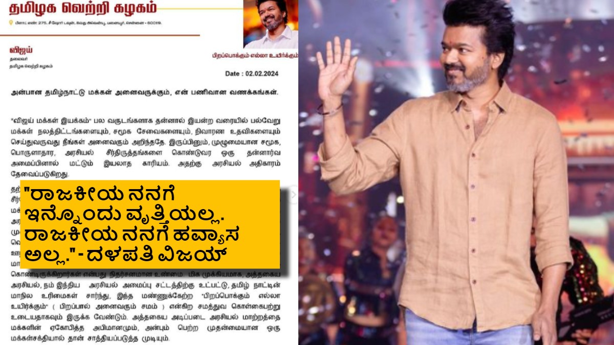 2024 ಲೋಕಸಭಾ ಚುನಾವಣೆ ಸಮೀಪದಲ್ಲಿರುವಂತೆಯೇ ರಾಜಕೀಯದ ಪಕ್ಷದ ಹೆಸರನ್ನು ಘೋಷಿಸಿದ್ದಾರೆ. ದಳಪತಿ ವಿಜಯ್ ಕಟ್ಟಿರೋ ಹೊಸ ರಾಜಕೀಯ ಪಕ್ಷಕ್ಕೆ 'ತಮಿಳಗ ವೆಟ್ರಿ ಕಳಂ' ಎಂದು ಹೆಸರಿಡಲಾಗಿದೆ. ಈ ಮೂಲಕ ದಳಪತಿ ವಿಜಯ್ ಅಧಿಕೃತವಾಗಿ ರಾಜಕೀಯಕ್ಕೆ ಎಂಟ್ರಿ ಕೊಟ್ಟಂತೆ ಆಗಿದೆ.