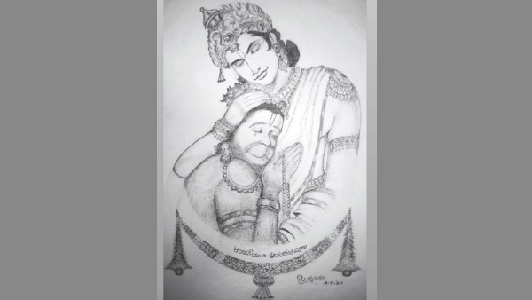 ಶ್ರೀರಾಮನು ಆಂಜನೇಯನನ್ನು ಎದೆಗೆ ಅಪ್ಪಿಕೊಂಡಿರುವ ಈ ಮನನೋಹಕ ಚಿತ್ರವನ್ನು ಖ್ಯಾತ ಹಾಸ್ಯನಟರೊಬ್ಬರು ರಚಿಸಿದ್ದಾರೆ.