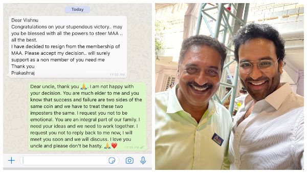 ಸೋತ ಕೂಡಲೇ ಮಂಚು ವಿಷ್ಣುಗೆ ವಾಟ್ಸ್ ಆಪ್ ಸಂದೇಶ ಕಳಿಸಿರುವ ಪ್ರಕಾಶ್ ರೈ, ''ನಿಮ್ಮ ಅದ್ಭುತ ಗೆಲುವಿಗೆ ಅಭಿನಂದನೆಗಳು. ಮಾ ಸಂಘವನ್ನು ಎತ್ತರಕ್ಕೆ ಕೊಂಡೊಯ್ಯುವ ಎಲ್ಲ ಶಕ್ತಿಗಳು ನಿಮಗೆ ಲಭಿಸಲಿ. ನಿಮಗೆ ಶುಭಾಶಯ. ಮಾ ಸಂಘಕ್ಕೆ ರಾಜೀನಾಮೆ ನೀಡಲು ನಾನು ನಿಶ್ಚಯಿಸಿದ್ದೇನೆ. ನನ್ನ ನಿರ್ಣಯವನ್ನು ನೀವು ಸ್ವೀಕರಿಸಿ. ಸದಸ್ಯನಾಗಿರದಿದ್ದರೂ ನಿಮಗೆ ನಾನು ಬೆಂಬಲ ನೀಡುತ್ತಿರುತ್ತೇನೆ. ಧನ್ಯವಾದಗಳು'' ಎಂದು ಸಂದೇಶ ಕಳಿಸಿದ್ದಾರೆ ಪ್ರಕಾಶ್ ರೈ.