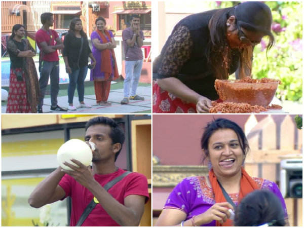 ಕಣ್ಣಿಗೆ ಪಟ್ಟಿ ಕಟ್ಟಿಕೊಂಡು ಫ್ರಿಡ್ಜ್ ನಿಂದ ತೆಗೆದುಕೊಳ್ಳುವ ಮೊದಲ ವಸ್ತುವನ್ನು ಸಂಪೂರ್ಣವಾಗಿ ಸೇವಿಸುವ 'ಬಾಂಬ್'ನ ಕೀರ್ತಿ ಮೇಲೆ ರೇಖಾ ಪ್ರಯೋಗಿಸಿದರು. ಅದರಂತೆ ಉಪ್ಪು ಸುರಿದಿದ್ದ ಮೊಸರನ್ನು ಕುಡಿಯಲು ಕೀರ್ತಿ ಒದ್ದಾಡಿದರು.